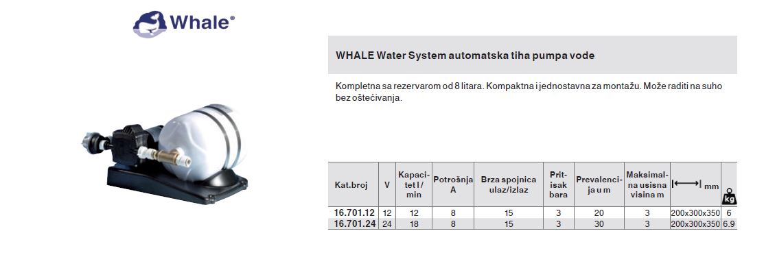 Automatska tiha pumpa vode Whale Water System 12V sa rezervarom od 8 litara